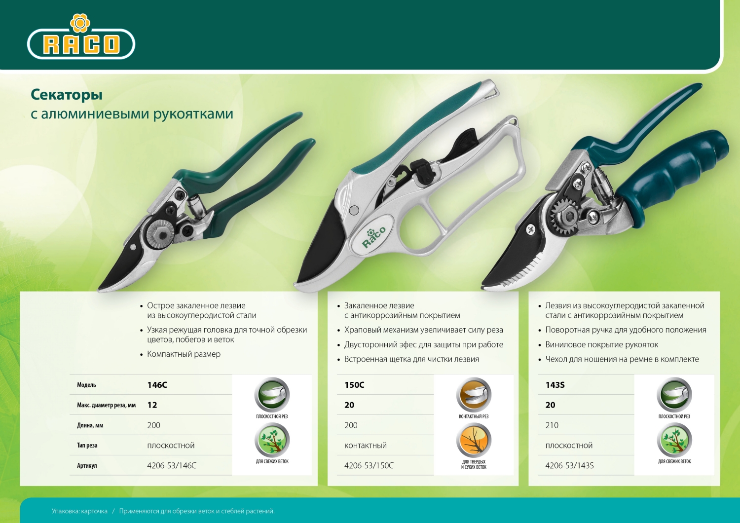 Секаторы RACO созданы для садоводов-любителей. Высококачественные материалы обеспечивают чистый рез и являются гарантией длительного срока службы изделия. А алюминиевые ручки делают инструмент легким.